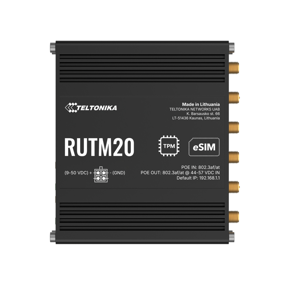 Teltonika RUTM20 ir īpaši kompakts 5G maršrutētājs, kas izstrādāts moderniem IoT un industriālajiem IIoT risinājumiem, kur nepieciešama ļoti ātra, stabila un nepārtraukta datu pārraide. Ierīce aprīkota ar globālu Telit 5G modemu, kas atbalsta gan SA (Standalone), gan NSA (Non-Standalone) 5G arhitektūru, nodrošinot lejupielādes ātrumu līdz 3,4 Gbit/s un augšupielādes ātrumu līdz 900 Mbit/s. Papildus tiek nodrošināts LTE un 3G atbalsts, kas ļauj uzturēt savienojumu arī vietās ar ierobežotu 5G pārklājumu. Lai nodrošinātu maksimālu savienojuma nepārtrauktību, maršrutētājs atbalsta divas fiziskās SIM kartes un integrētu eSIM. Ierīce automātiski pārslēdzas starp operatoriem atkarībā no signāla kvalitātes, datu patēriņa, roaming statusa vai citiem iepriekš definētiem nosacījumiem. eSIM funkcionalitāte ļauj attālināti pārvaldīt līdz pat 7 profiliem, kas ir īpaši svarīgi lielapjoma projektiem, kur nepieciešama centralizēta pārvaldība bez fiziskas piekļuves ierīcēm.