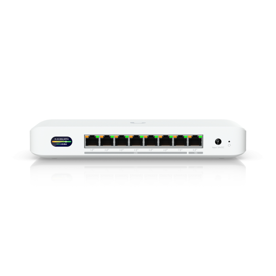 UDB-Switch apvieno komutatora, bezvadu tilta un PoE+ barošanas avota funkcionalitāti vienā ierīcē. Visi astoņi Ethernet porti atbalsta PoE+ ar jaudu līdz 30 W uz portu, nodrošinot tiešu barošanu pieslēgtajiem UniFi piekļuves punktiem, IP kamerām un citām ierīcēm. Komplektā ietilpst 60 W barošanas adapteris, kas nodrošina kopējo PoE budžetu 35 W apmērā, kas ir ideāli piemērots kompaktām tīkla izvietošanas konfigurācijām. Ja nepieciešams, var izmantot opcionālo adapteri ar jaudu 210 W, tādējādi palielinot kopējo pieejamo PoE jaudu līdz 185 W, kas nodrošina iespēju apkalpot jaudīgākas ierīces vai lielāko ierīču skaitu. Ierīces maksimālais jaudas patēriņš nepārsniedz 25 W (neņemot vērā PoE slodzi). UDB-Switch var uzstādīt gan uz galda, gan pie sienas, kas to padara par praktisku risinājumu birojiem, veikaliem, noliktavām un izkliedētiem tīkla mezgliem.