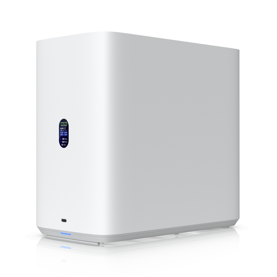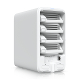 UNAS 4 piedāvā elastīgas uzglabāšanas iespējas ar četriem disku nodalījumiem, kas atbalsta gan 2.5 collu, gan 3.5 collu cietos diskus. Papildus tam ir pieejami divi M.2 NVMe sloti, kas paredzēti SSD kešatmiņai vai papildu veiktspējas uzlabošanai. Šāda konfigurācija nodrošina ātru datu piekļuvi un pietiekami lielu uzglabāšanas apjomu dažāda veida failiem. Ierīces barošana tiek nodrošināta ar PoE+++ tehnoloģiju, kas vienkāršo uzstādīšanu un novērš nepieciešamību pēc atsevišķa barošanas kabeļa. Komplektā iekļautais 90 W PoE+++ adapteris garantē uzticamu barošanu, bet diskiem pieejamais jaudas budžets līdz 80 W ļauj droši darbināt vairākus diskus. Enerģijas patēriņš līdz 90 W palīdz saglabāt efektivitāti ilgstošā lietošanā.